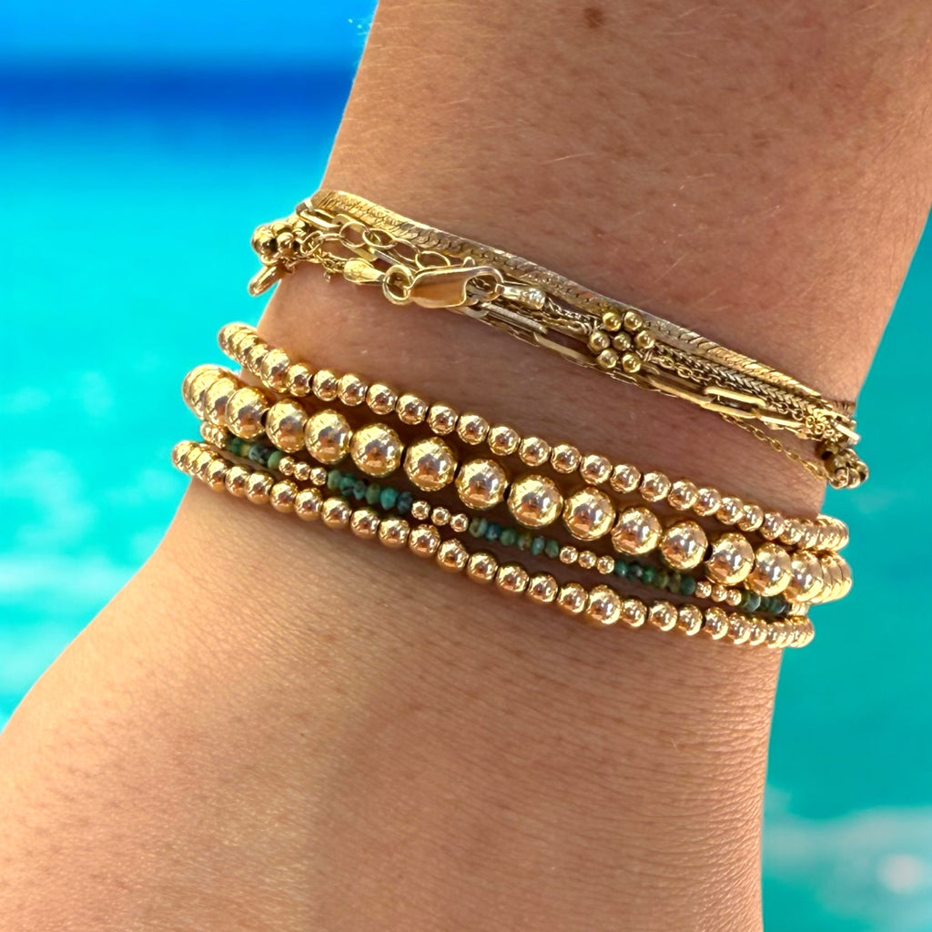 These gold beads are crafted by bonding 5 thick layers of 18k gold to a base metal, creating a durable and long-lasting material that can withstand exposure to water without losing its luster.