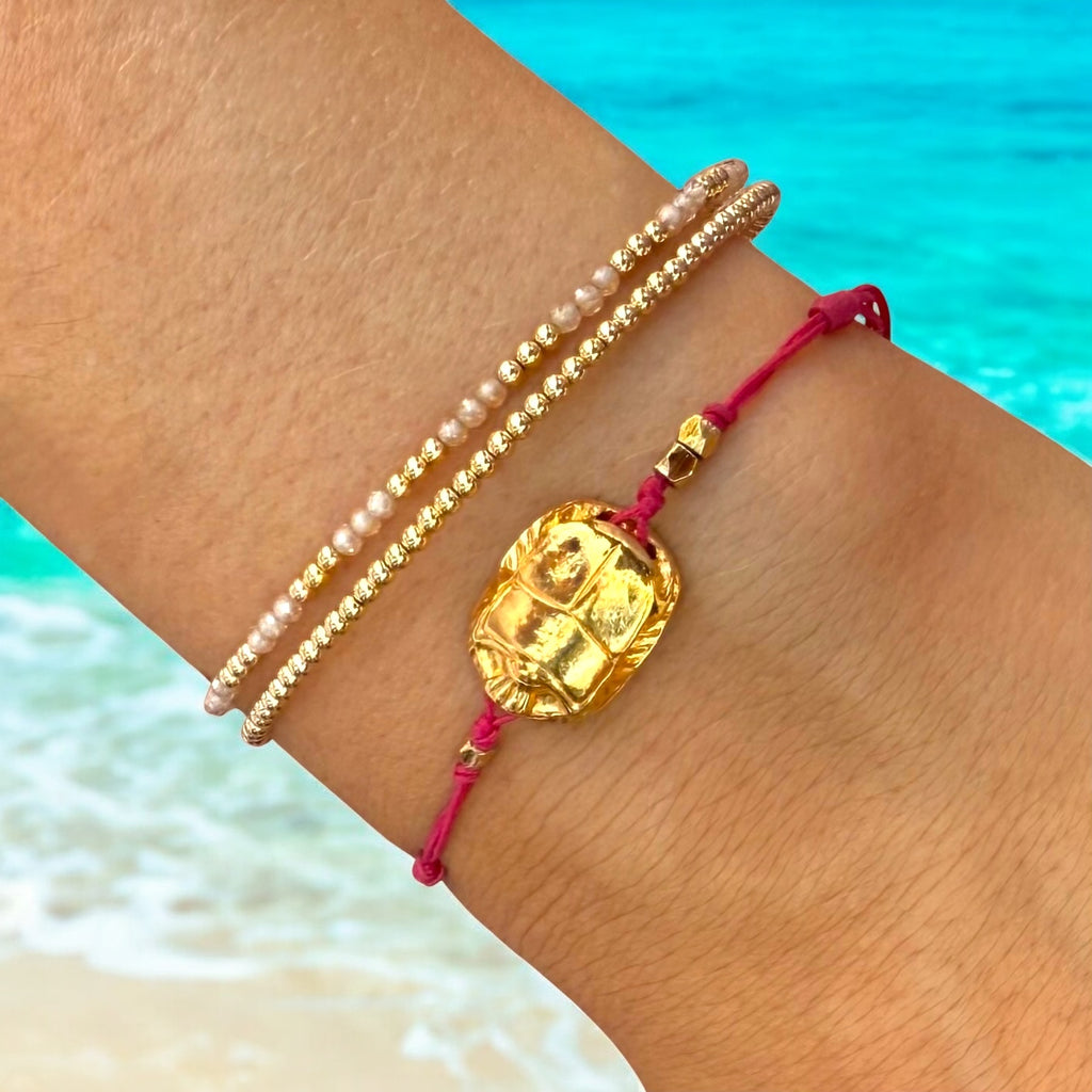 These gold beads are crafted by bonding 5 thick layers of 18k Gold to a base metal, creating a durable and long-lasting material that can withstand exposure to water without losing its luster