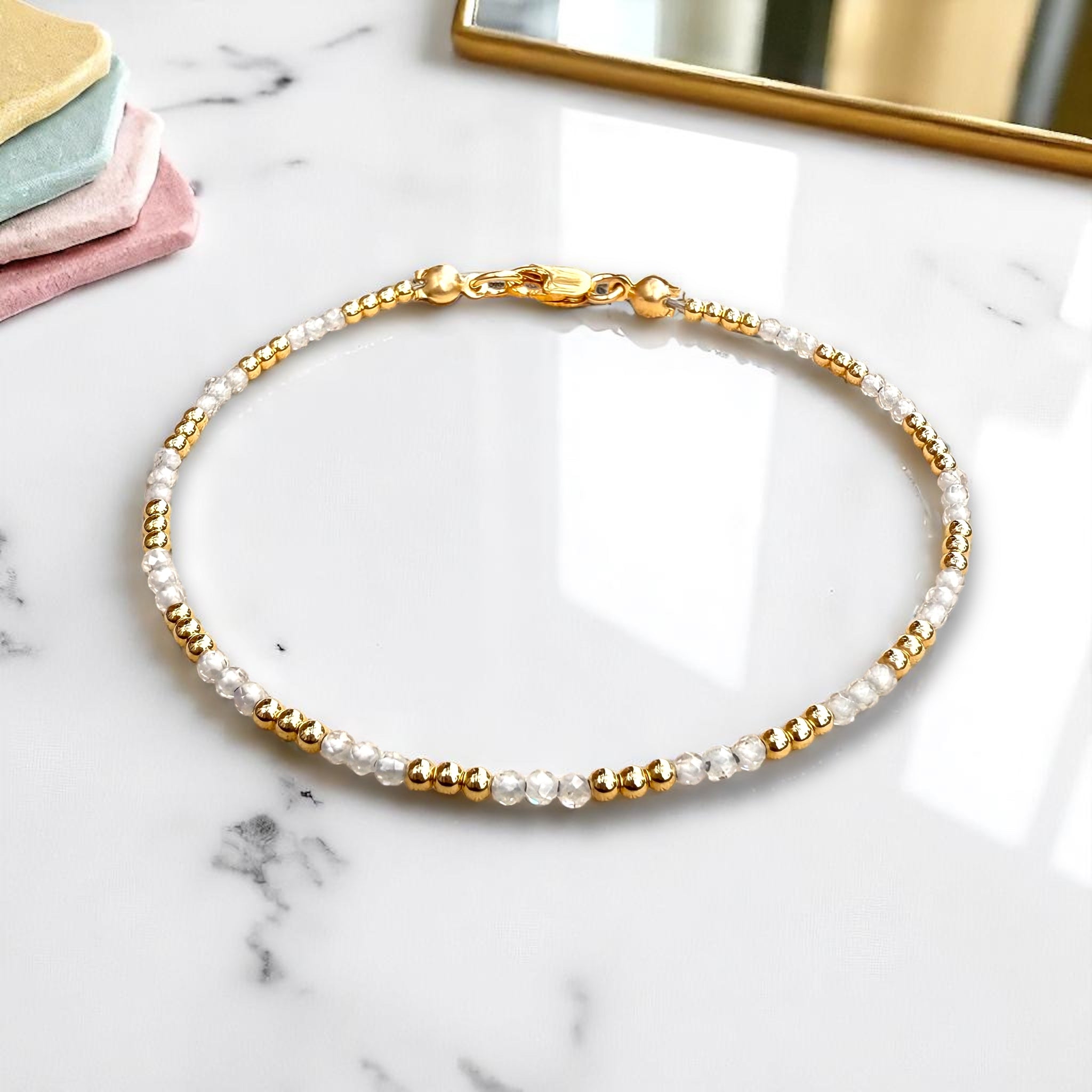 Introducing our Gitze Luxe Bracelet, a symbol of elegance and sophistication. This beautifully crafted bracelet features a delicate Clear Cubic Zirconias with 18k Gold Filled Dainty Beads.
