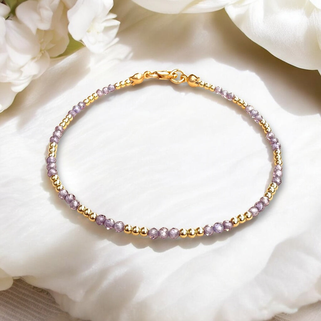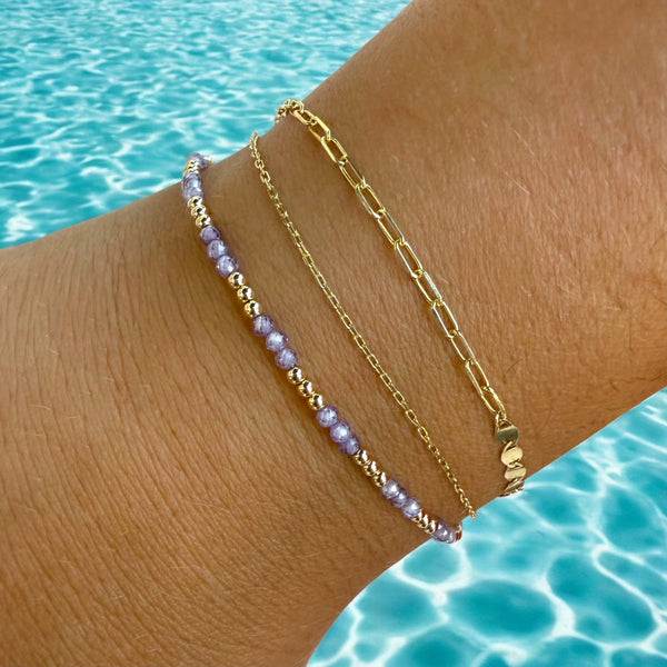 Introducing our exquisite 18 Karat Gold Filled Beaded Bracelet, adorned with vibrant Lavender Cubic Zirconias. This elegant piece is designed for both style and durability, being water resistant and tarnish free, ensuring it remains a cherished accessory for years to come.