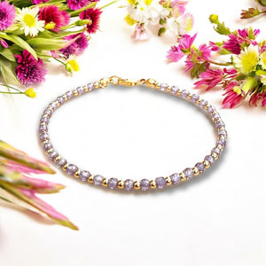 Introducing our Viorelle Bracelet, a symbol of elegance and sophistication. This beautifully crafted bracelet features a delicate Lavender Cubic Zirconias with 18k Gold Filled Dainty Beads.